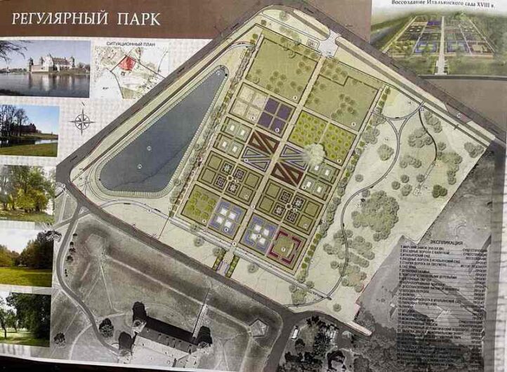 Немного о самом парке: "Из исторических источников XVIII века известно, что парк состоял из 25 квадратов, и в нем выращивались фруктовые деревья, овощи и травники. Итальянский парк будет восстановлен на том месте, где он был расположен при Радзивиллах. Кроме высаженных деревьев, здесь будут сделаны клумбы, обустроены дорожки. Во время прогулки по парку, наполненному запахом цветущих деревьев, кустарников и цветов, туристы смогут получить истинное эстетическое удовольствие."